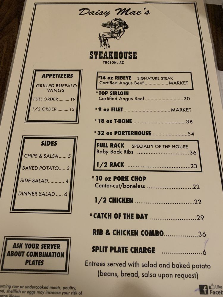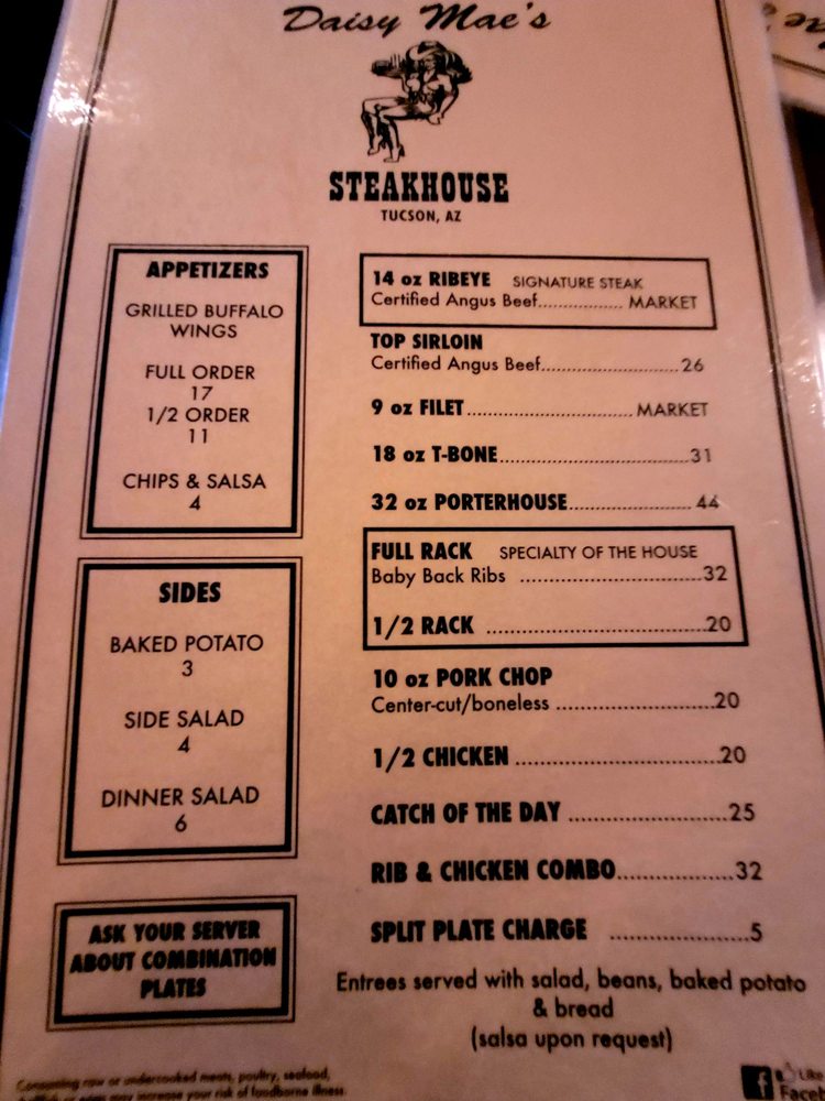 Daisy Mae's Steak House, nestled in Tucson, AZ, offers a robust menu that showcases its commitment to quality and flavor. The star of the show is undoubtedly the perfectly cooked steaks—especially the rib-eye, celebrated for its juiciness and flavor. Guests rave about the fall-off-the-bone ribs accompanied by tangy BBQ sauce and hearty sides like baked potatoes and seasoned beans.